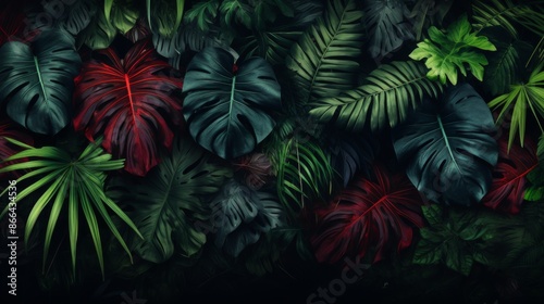 A stunning image capturing lush green tropical foliage sprinkled with various shades of dark green and pops of red, adding a vibrant and exotic appeal to the scenery.