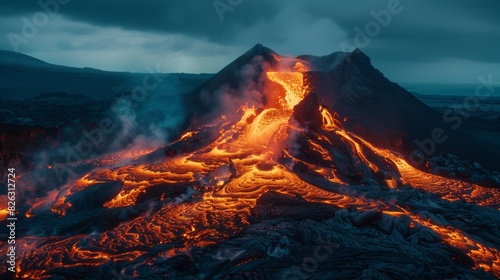 A stunning image of a volcanic eruption at dusk, showcasing molten lava streams flowing down the mountain under a dramatic sky.