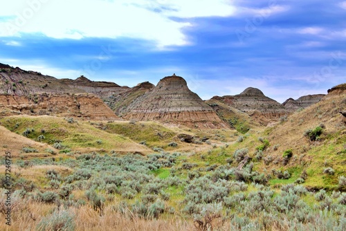 A stunning image of the rugged Badlands terrain featuring layered hills, eroded rock formations, and lush sagebrush vegetation under a vibrant blue sky. The dramatic geological features and golden gra