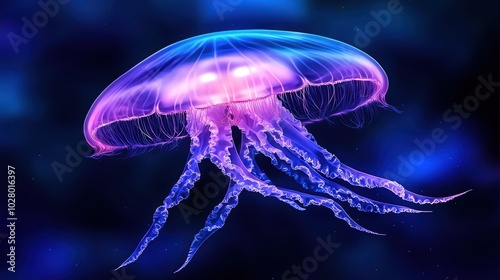 A stunning jellyfish gracefully floating in the deep ocean, with vibrant blue and purple colors illuminating its translucent body.