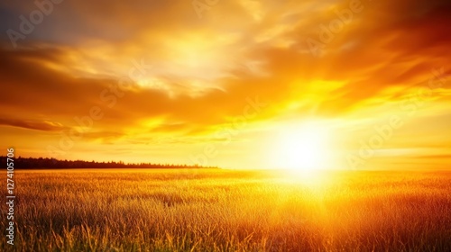A stunning landscape showcasing a golden sunset over a sprawling field of wheat. The vibrant colors blend beautifully, creating a serene and peaceful atmosphere.