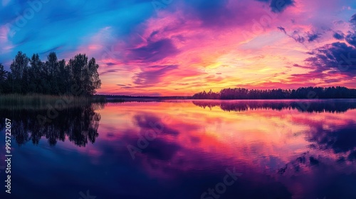 A stunning panorama of a tranquil lake reflecting the vibrant hues of a sunset sky. The clouds create a breathtaking display of color, painting the water in a symphony of shades.