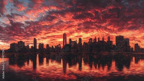 A stunning panorama of New York City at sunset, with the skyline glowing against the fiery sky and reflections in the water.