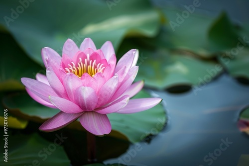 A stunning pink lotus flower opens its petals in a tranquil pond, nestled among vibrant green lily pads under the warm afternoon sun.