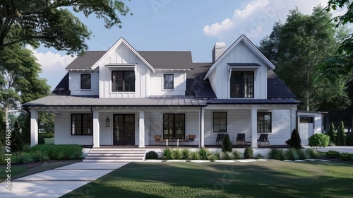 A stunning representation of a modern white house with dark roofing surrounded by lush greenery and a clear blue sky, showcasing contemporary living
