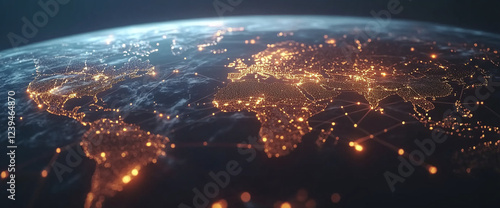 A stunning satellite view of Earth showcasing global connectivity, with illuminated city lights forming networks across continents, symbolizing the interconnectivity of the modern world.