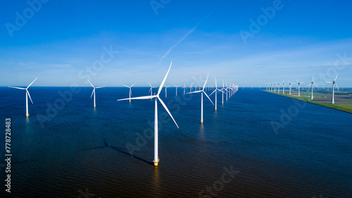 A stunning scene of countless windmills standing tall in a vast body of water in the ocean