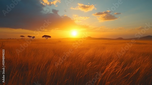 A stunning sunset over golden grasslands with silhouettes of trees in the distance.