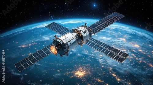 A stunning view of a modern satellite orbiting Earth with solar panels reflecting sunlight, emphasizing technology in space exploration