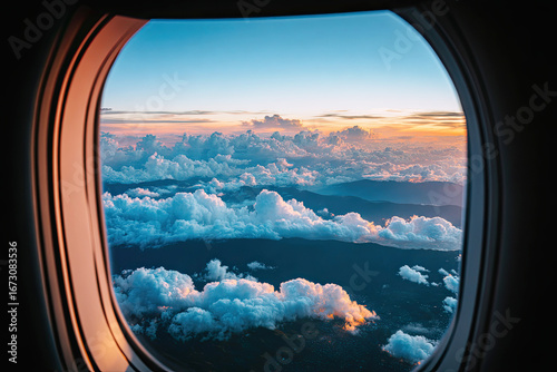 A stunning view of clouds and mountains at sunset seen through an airplane window, capturing the beauty of the sky and horizon.