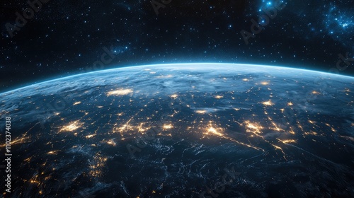 A stunning view of Earth at night, showcasing glowing city lights and a serene atmosphere in space.