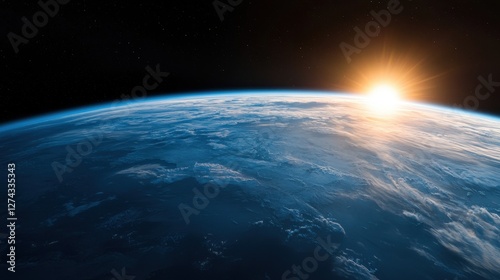 A stunning view of Earth from space during sunrise, showcasing the blue oceans and fluffy clouds against a backdrop of the cosmos.