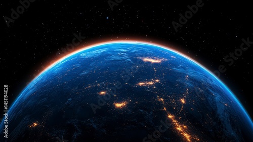 A stunning view of Earth from space highlighting glowing city lights and the delicate atmosphere in the vastness of the universe