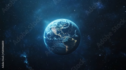 A stunning view of Earth from space, highlighting shimmering city lights across North and South America against a starry backdrop.