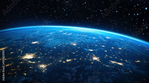 A stunning view of Earth from space, showcasing the planet's bright lights and vastness against the backdrop of the Milky Way.