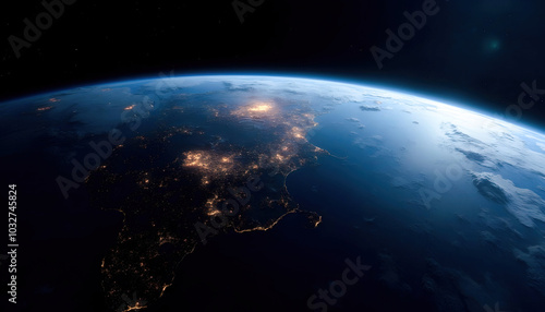 A stunning view of Earth from space, showcasing the planet's vibrant blue oceans, swirling white clouds, and green landmasses, with distant stars twinkling in the background.