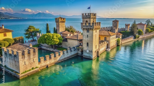 A stunning view of the ancient stone walls and towering turrets of Sirmione Castle overlooking Lake Garda
