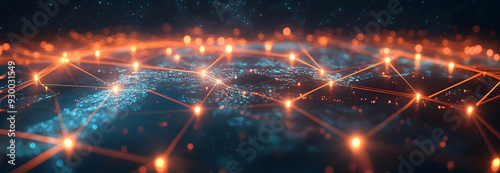 A stunning visualization of a global network connection with illuminated lines and nodes representing data exchange across continents, highlighting the interconnected world of modern technology.