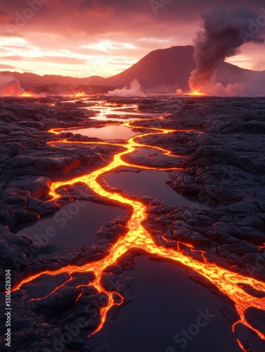 A stunning volcanic landscape featuring glowing lava flows against a dramatic sunset sky, capturing the raw power of nature.