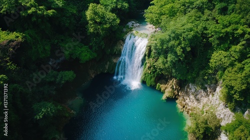 A stunning waterfall cascades into a turquoise pool, surrounded by lush greenery, creating a serene natural oasis.
