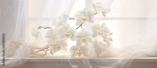A stunning white Orchid with large flowers sits on the windowsill creating a lovely contrast against the delicate tulle curtains Copy space image
