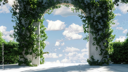 a stylish archway with a wooden base, surrounded by green foliage, with a blue sky and white clouds in the background