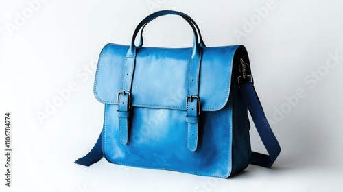 A stylish blue leather bag with a structured design, suitable for business or casual use.