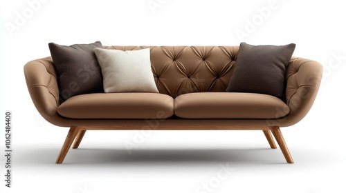 A stylish brown sofa with tufted backrest and seat, complemented by neutral-toned pillows and supported on elegant wooden legs, perfect for living room settings.