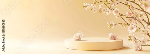 A stylish circular podium with ample empty space, placed on a soft, pastel yellow background, evoking the warmth of Mother's Day