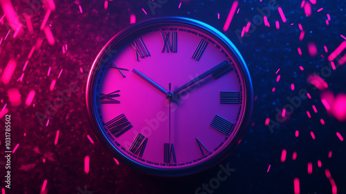 A stylish clock with Roman numerals surrounded by vibrant neon colors, creating an energetic ambiance that symbolizes the passage of time and modern aesthetics.