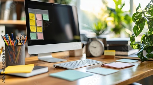 A stylish home office setup featuring a computer, stationery, and plants, ideal for productivity and creativity.