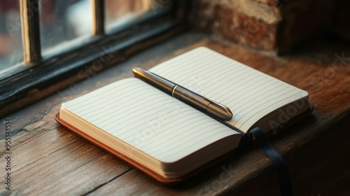 A stylish leather-bound notebook lying open on a wooden desk, with a pen poised above the lined pages and a soft glow from a nearby window.
