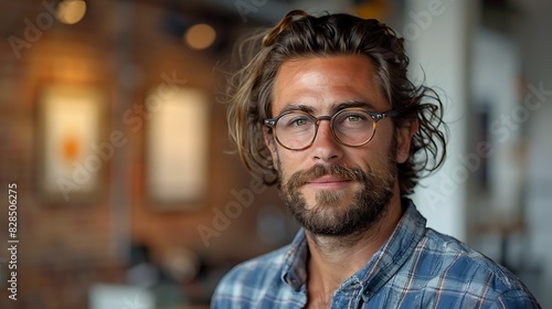 A stylish man with glasses and a beard poses confidently in a casual setting with a blurred background.