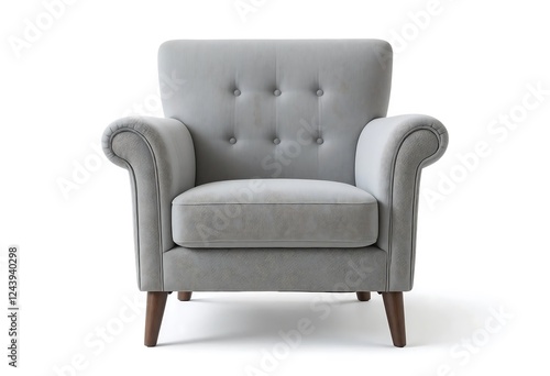 A stylish minimalist armchair in soft gray fabric exemplifies modern design and simplicity in home decor. Minimalist lifestyle.