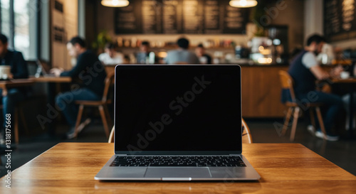 A stylish, modern laptop with a white blank screen, set on a coworking space table with an industrial-style background. The shot is slightly angled for a dynamic and realistic look
