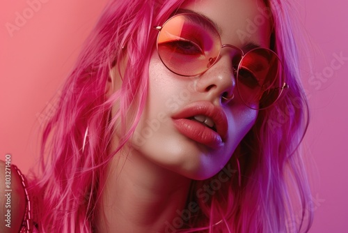 A stylish woman with pink hair wearing sunglasses. Perfect for fashion blogs or social media posts