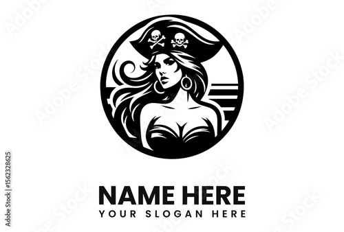 A stylized black and white illustration of a female pirate, in a circular frame.