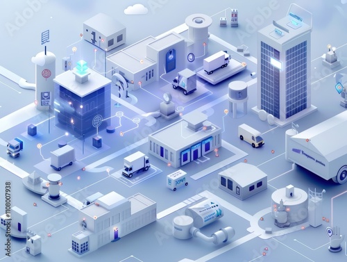 A stylized cityscape featuring various buildings and vehicles in a grid layout.