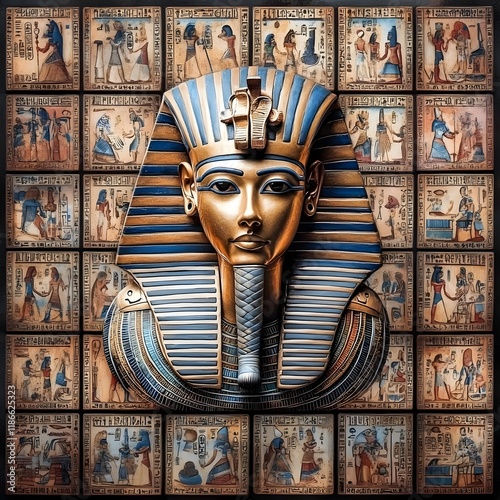 A stylized depiction of a pharaoh's bust surrounded by ancient Egyptian hieroglyphs.
