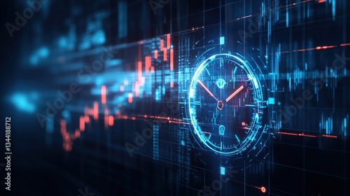 A Stylized Digital Clock Face with Glowing Red and Blue Accents on Dynamic Abstract Data Streams and Graphs Representing Rapid Technological Progression