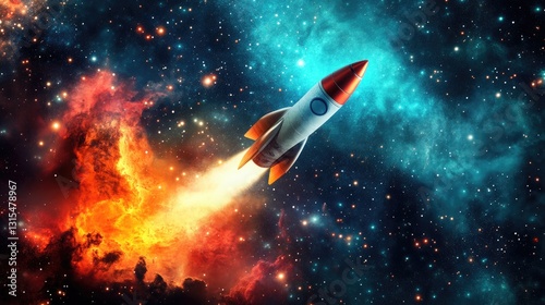 A stylized digital painting of a rocket soaring through a colorful nebula.