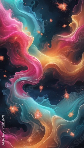 A stylized, dynamic abstract representation of nebula fragments, characterized by vibrant, swirling patterns and kaleidoscopic hues of hot pink, turquoise, and warm amber, gradating into deep,