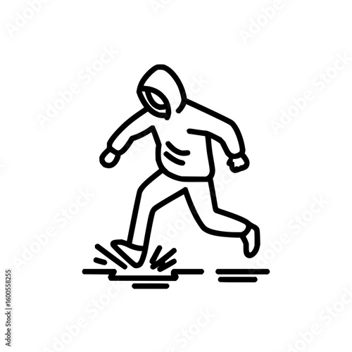 A stylized figure in a coat running through grass in a rain shower depicted in a simple line drawing