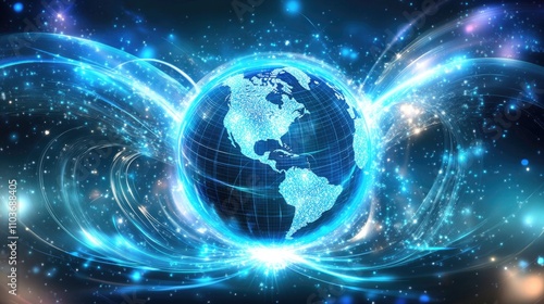 A stylized globe surrounded by swirling light trails symbolizing connectivity; minimalist, neon gradients, black and blue background, elegant composition