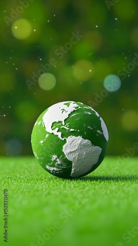 A stylized green globe rests on vibrant green grass against a bokeh background of blurred green and yellow lights suggesting a natural, environmentally conscious theme