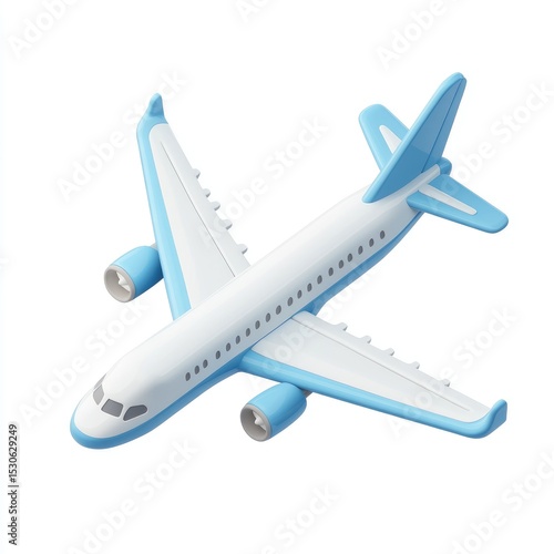 A stylized, light-blue and white passenger jet airplane, depicted in a three-quarter view against a white background, rendered in a simplified, cartoonish style