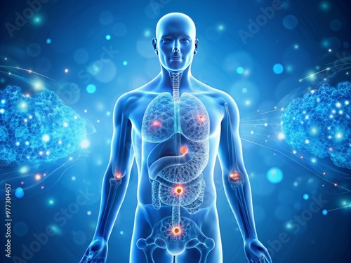 A stylized medical illustration of a human body with a highlighted pancreas, surrounded by tiny blood cells and a subtle insulin molecule pattern
