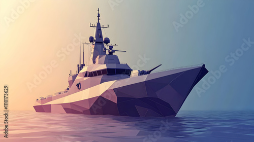A stylized polygonal representation of a naval ship on calm waters at sunset.