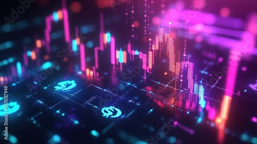 A stylized representation of financial growth with upward stock charts and glowing currency symbols.