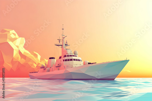 A stylized ship in a low-poly design sailing on calm waters during sunset.